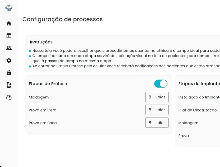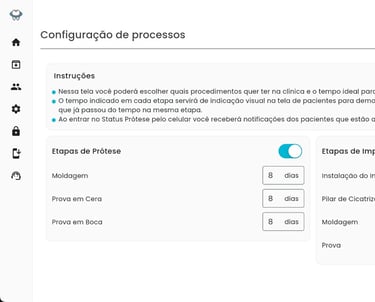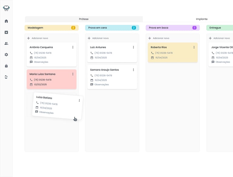 Nosso sistema oferece um kanban visual intuitivo, com todos os pacientes ativos, indicativos de atraso, controle de saída para laboratório, histórico de etapas, notificações automáticas e muito mais.